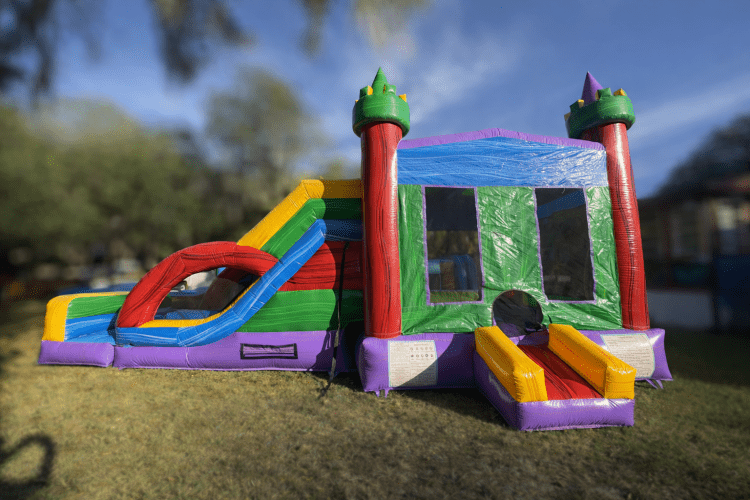 Color Craze Castle Combo. Bring the party to life with this vibrant, eye-catching inflatable castle combo. The Color Craze Castle combo features bright, playful colors and a roomy bounce area with two basketball hoops, where children can jump, laugh, and burn off energy safely. The actual dimensions of the unit is 34x17x13. The exit slide is a 6.5' dual lane. This unit can be used wet or dry.
