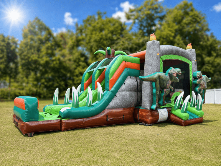 This Extra-Large dinosaur themed Combo features two basketball hoops inside the jumping area, a dual lane 7.5' slide with a climbing ladder. With the 3D printed dinosaurs, and dinosaur teeth this combo is perfect for dinosaur themed events. This unit can be used wet or dry. Actual dimensions are 34' x 17' x 14'