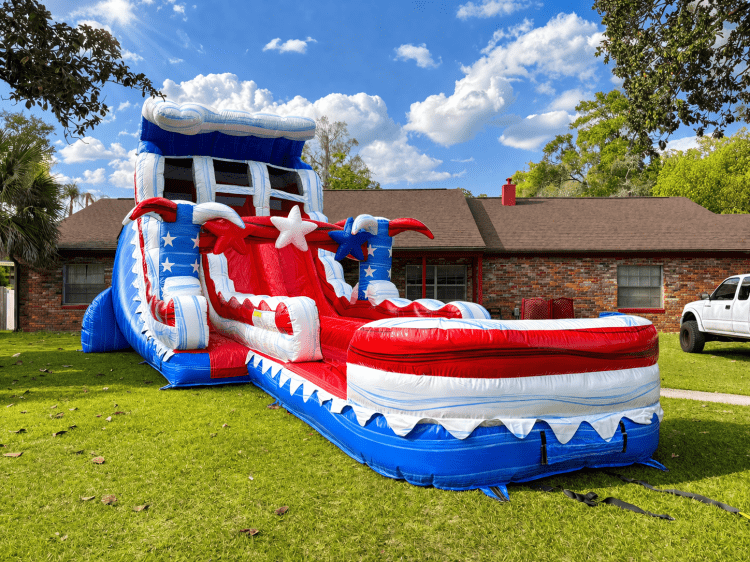 Bring a big splash of excitement to your next event with the 18' Freedom Falls Dual Lane Waterslide. This eye-catching inflatable is designed for fast-paced fun, giving riders two lanes so they can race side by side and enjoy the ride at the same time. The 18-foot height adds an exciting drop that makes it a standout attraction for parties, celebrations, school events, and summer gatherings. Actual dimensions 37'Lx19'Wx18'H