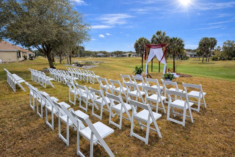 The classic white chairs offer a timeless look that complements any wedding style, while the natural wood arbor creates a warm, romantic focal point for your ceremony. The flowing white scarf adds a soft, graceful touch — perfect for photos and that unforgettable “I do” moment.